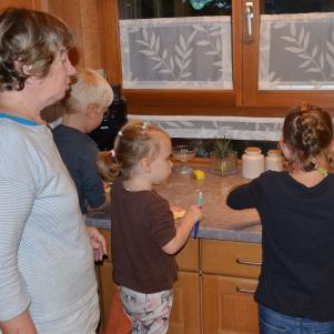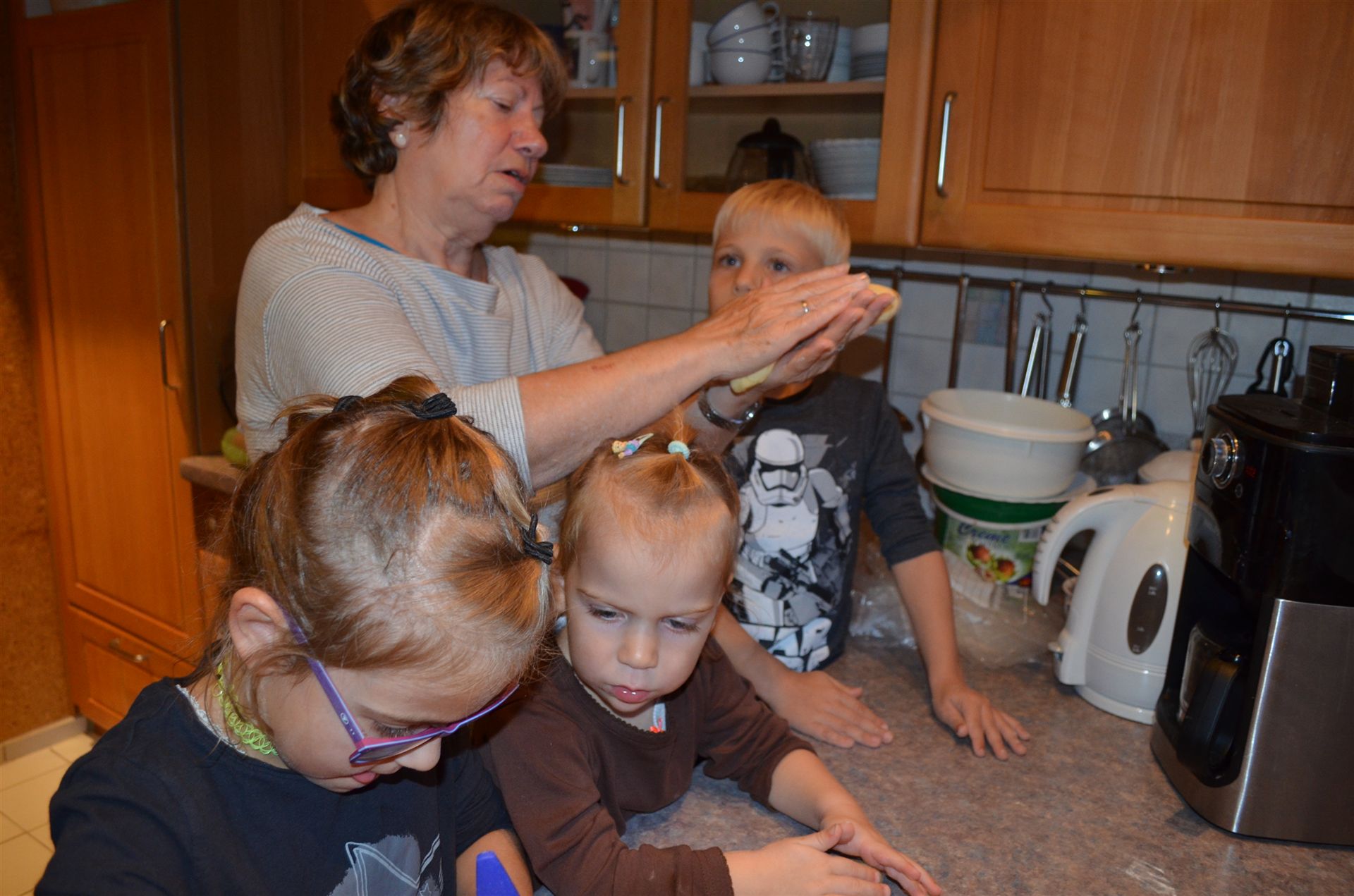 Drei Kids mit Oma beim backen