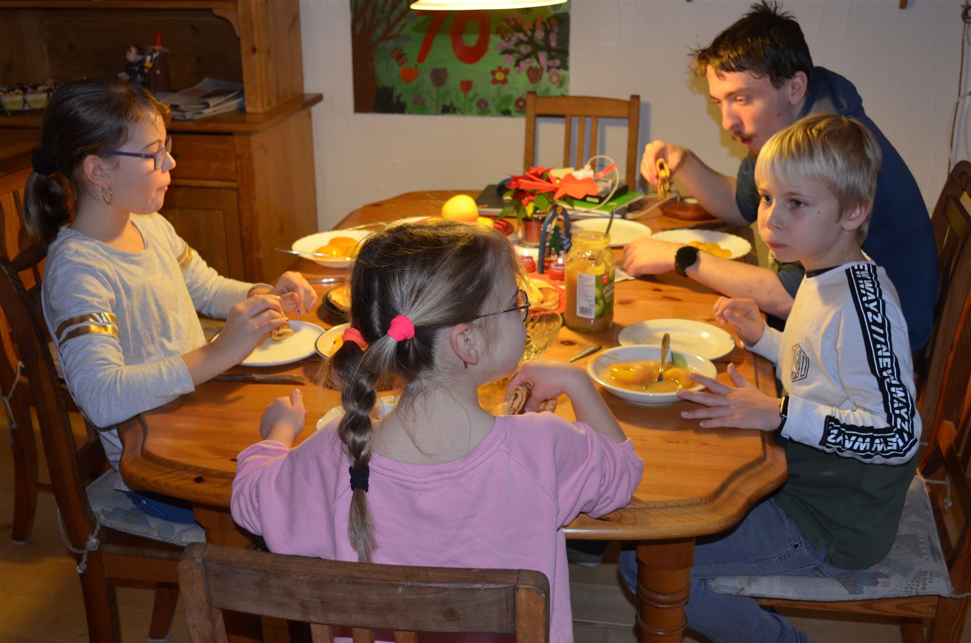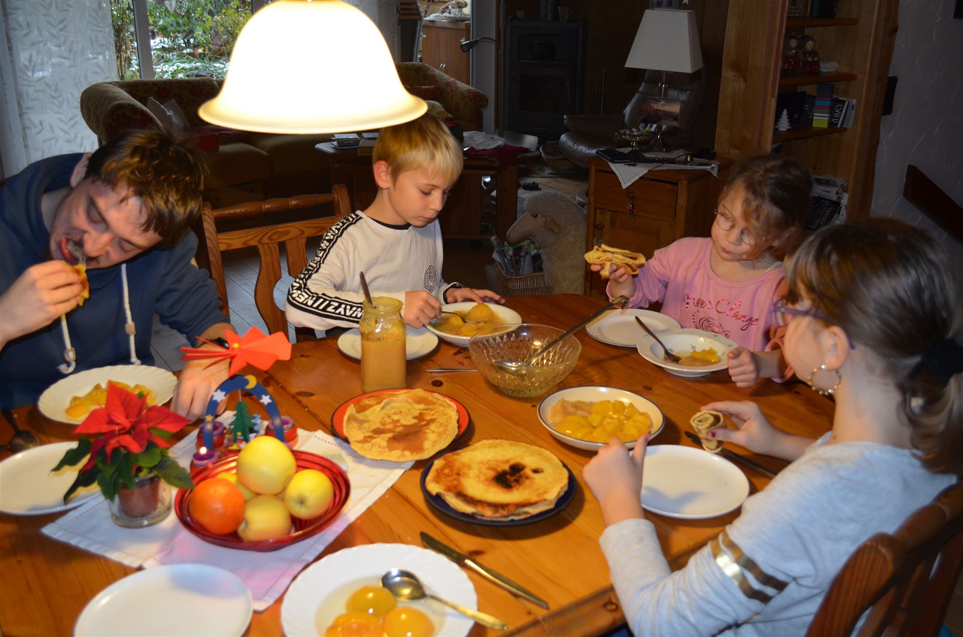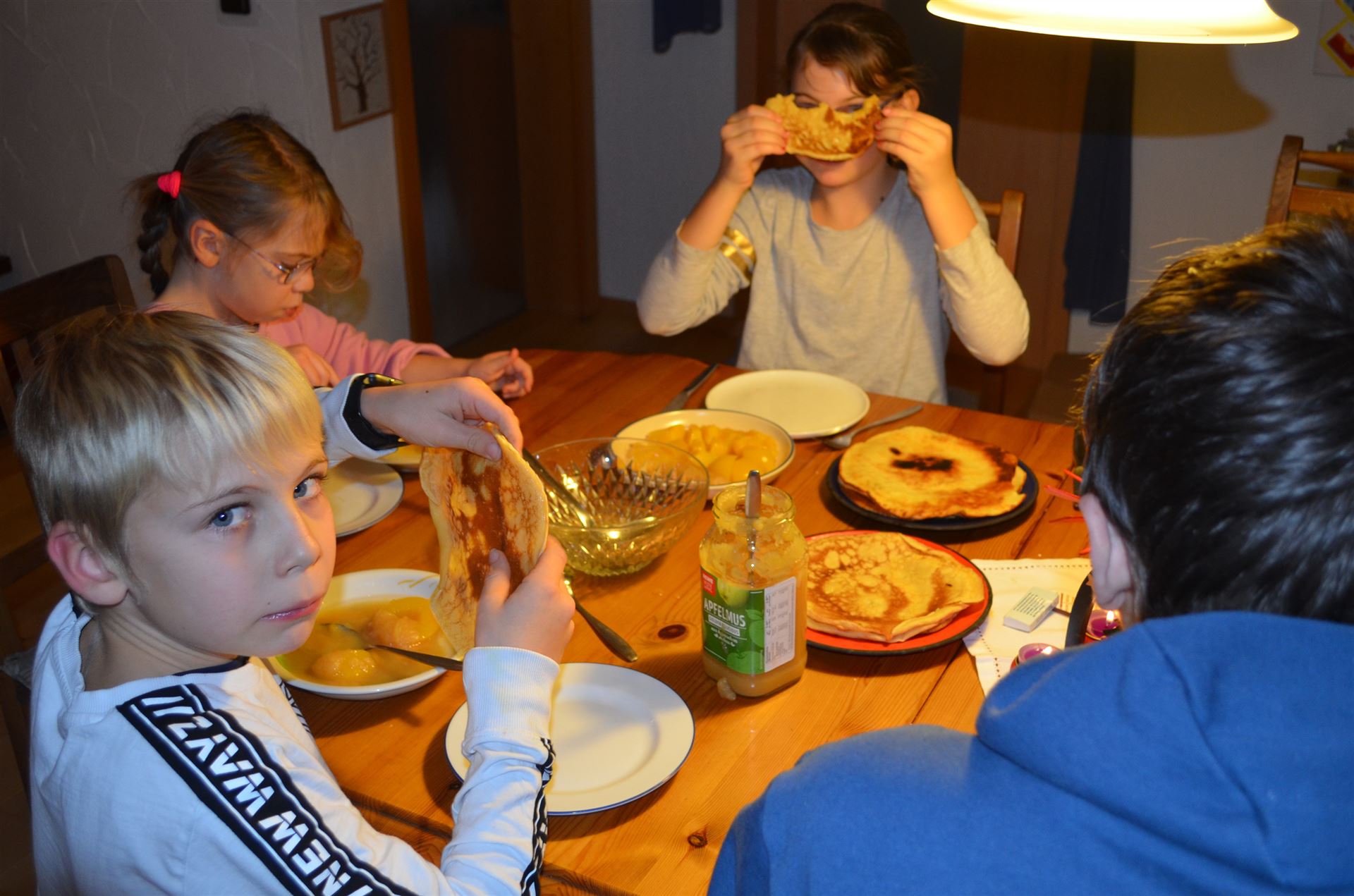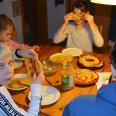 Mit Milena, Nicklas, Luisa sowie Lukas sind wir zusammen Essen (Pfannkuchen & Obst) in Lauffen und dann wird gebacken.