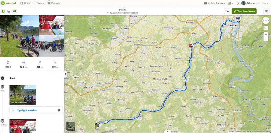 Unsere Tour an diesem Tag/leider die letzte: Von Cochem (der Bus fährt uns nach Cochem) nach Koblenz (Dreiländereck) mit knappe 52 km