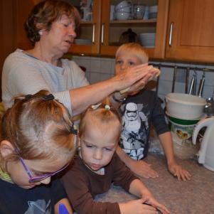 Drei Kids mit Oma beim backen