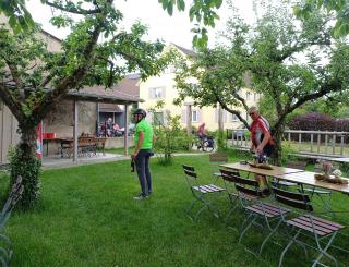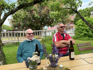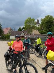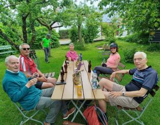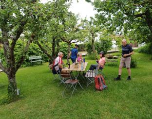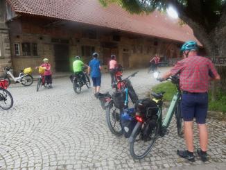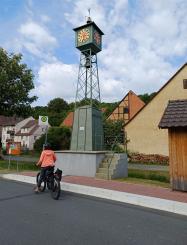 An diesem Tag fuhren wir nur zu acht. 4 Personen hatten sich abgemeldet. Der eine oder andere konnte nicht wegen Schmerzen oder ähnliches. Insgesamt fuhren wir an diesem Tag 73 km. Es ging wieder auf und ab und unterwegs sahen wir eine Uhr (nach 9,3 km), die man so nicht immer sieht und dann haben wir an einem tollen Pausenplatz angehalten (16 km). Wir fuhren die Strecke über Adolzhausen, Spielbach, Wermutshausen, Laudenbach, Weikersheim bis nach Bad Mergentheim.